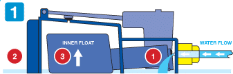 This will in turn allow the ‘inner float’ to rise and shut off the supply (3). The water level is now 20mm.