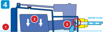 Once the tank is filled with water and liquid feed, it will begin to travel through the pipe from the tank. It will pass through the AQUAvalve nozzle (1) and into the tray. As the tray fills (2) with water air is trapped inside the main body and around the ‘inner float’ causing it to try and rise (3).